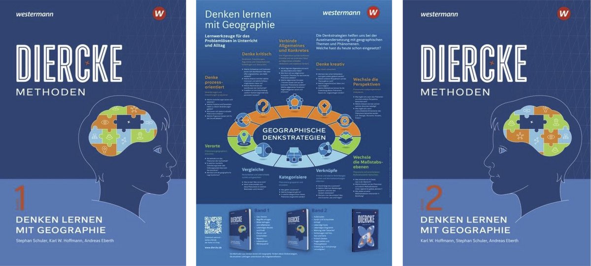 Das Ziel des Projektes "Denken lernen mit Geographie" ist es, problemorientierte und kognitiv aktivierende Methoden und Aufgabenformate bereitzustellen, bei denen Lernende in der Auseinandersetzung mit geographischen Begriffen, Themen und Problemen auf eine motivierende Weise zum Nachdenken, Mitdenken und Weiterdenken angeregt werden. Dazu wurden einfache und zugleich effektive Methoden und Aufgabenformate konzipiert, mit denen sich verschiedene Denkfertigkeiten und Denkstrategien gezielt fördern lassen. Ein zentrales Ergebnis des Projekts sind zwei Praxis-Bände mit Unterrichtsmethoden, die 2026 als umfassende Neubearbeitung erscheinen: Band 1 "Diercke Methoden - Denken lernen mit Geographie 1" stellt die Konzeption und die ersten neun Methoden vor. Band 2 "Diercke Methoden - Denken lernen mit Geographie 2" fügt acht weitere Methoden hinzu und zeigt zudem auf, wie komplexe Lernaufgaben als Arrangement aus mehreren aufeinander abgestimmten Methoden gestaltet werden können. In beiden Bänden werden die einzelnen Methoden jeweils durch drei unterrichtspraktische Aufgabenbeispiele konkretisiert. Ein Grundlagenkapitel erläutert die didaktische Konzeption mit ihren lernpsychologischen und fachdidaktischen Hintergründen. In der Neubearbeitung 2026 werden zudem besonders viele Tools für die metakognitive Aufgabenreflexion angeboten, insbesondere auch viele universelle und methodenspezifische Arbeitsblätter für die Selbstreflexion der Lernenden. Ein zentrales Element sind die zehn Geographischen Denkstrategien, die konzeptionell erweitert und mit einem neuen Lernplakat für die Lernenden übersichtlich aufbereitet wurden. "Denken lernen mit Geographie (DLmG)" ist aktuell ein Kooperationsprojekt zwischen: